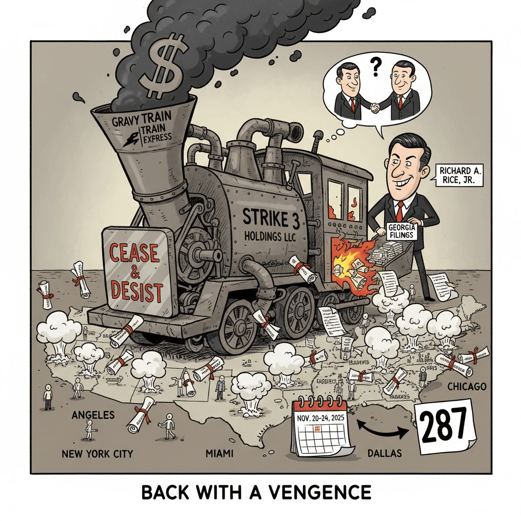 The pattern is undeniable: after a quick, mysterious pause, Strike 3 Holdings has returned with incredible speed and efficiency. The brief silence of late October was not a retreat; it was merely the loading of 116 more high-powered, settlement-seeking legal shells.